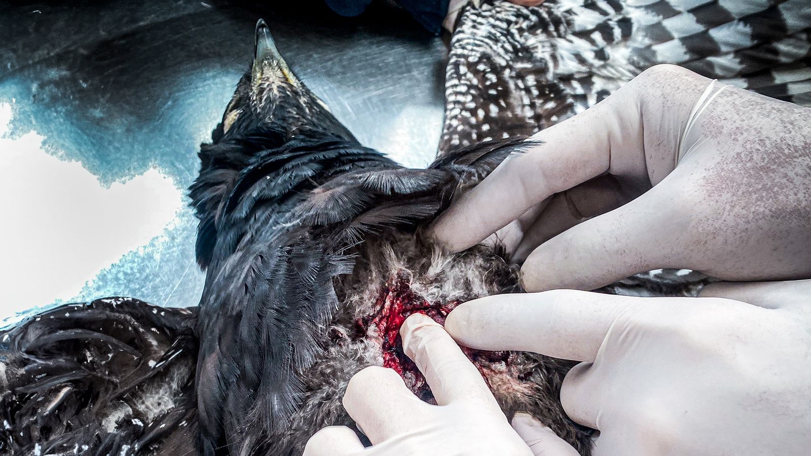 La revisión veterinaria confirmó que presentaba buena condición corporal, plumaje en perfecto estado y garras completas, pero su quilla pectoral estaba fracturada, con la perforación del impacto.