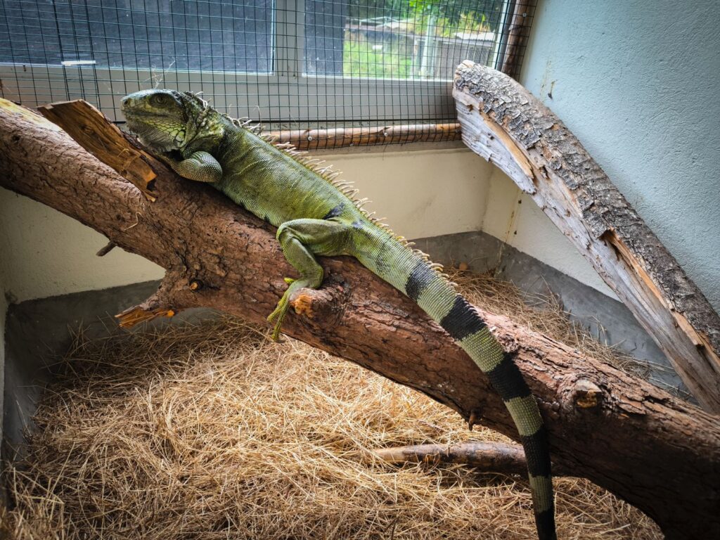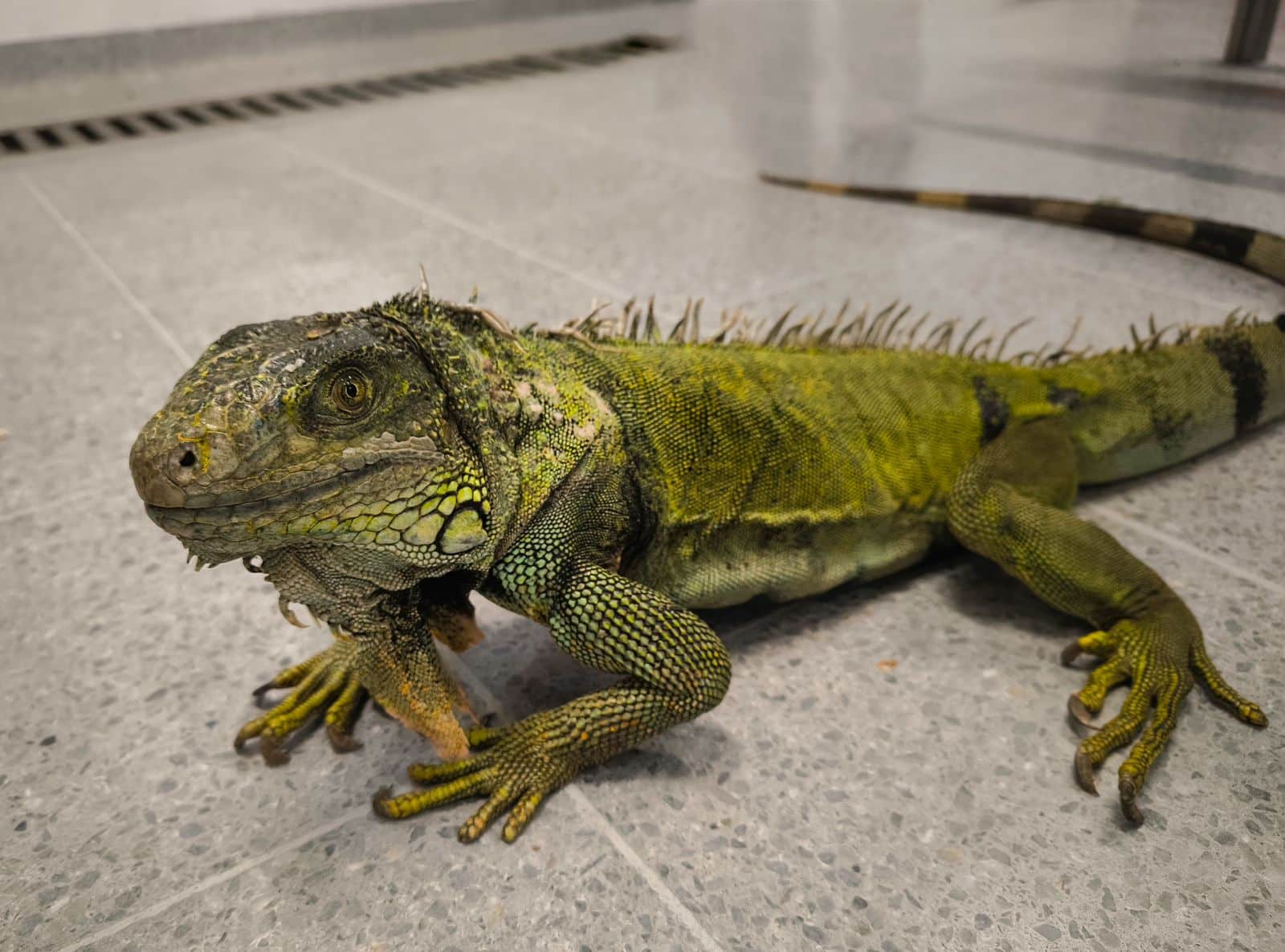 Además, se observó desnutrición, piel seca con descamación y un comportamiento totalmente alterado por el cautiverio: la iguana estaba extremadamente amansada, no corría ni reaccionaba como lo haría un individuo silvestre, lo que evidencia la pérdida de sus conductas naturales.