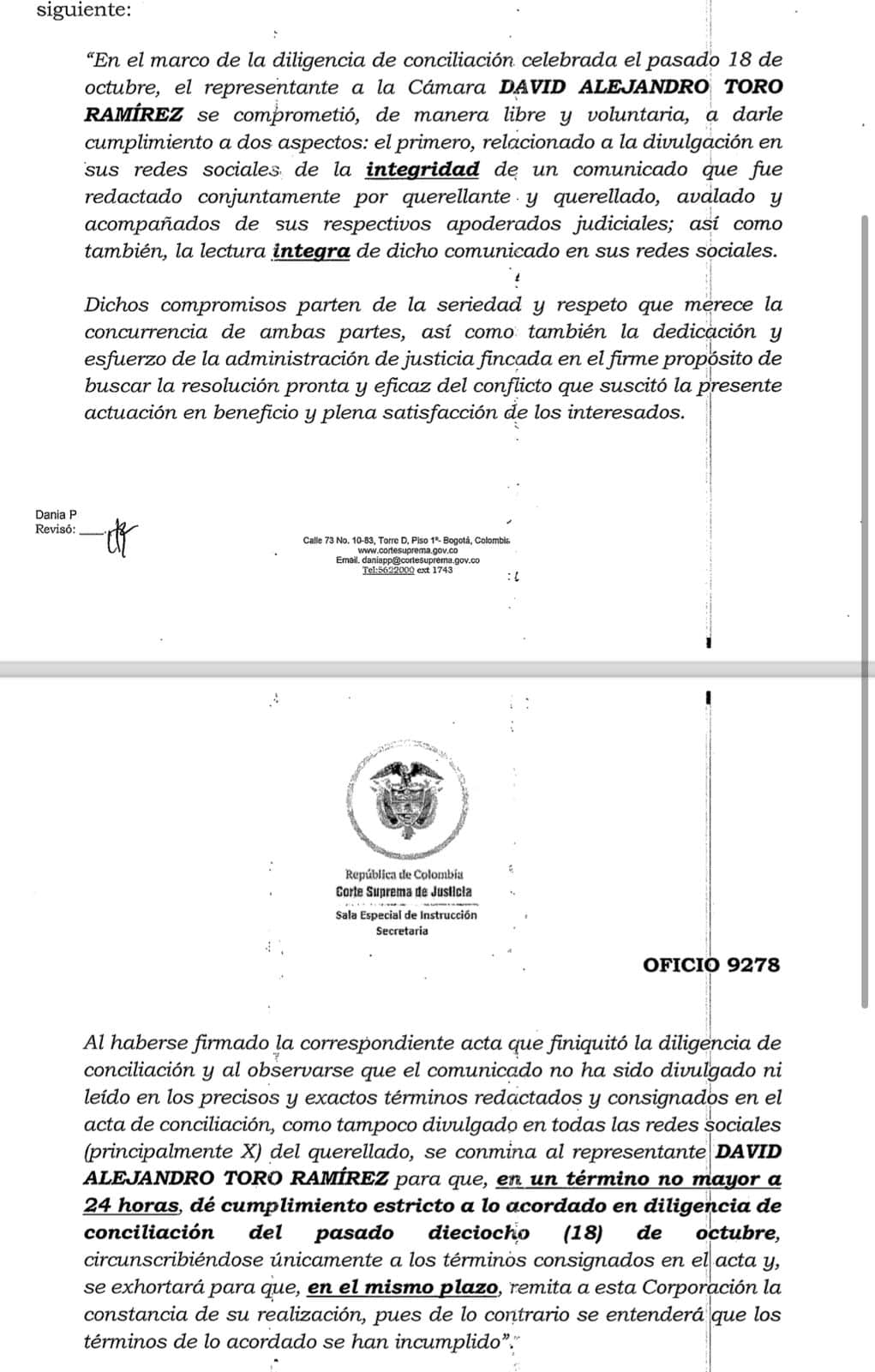 Un plazo de 24 horas le dio la Corte Suprema de Justicia el representante David Alejandro Toro para que cumpla los acuerdos que hizo el pasado 18 de octubre en el alto tribunal, para rectificar en forma clara y contundente, sin esguinces, una rectificación relacionada con unas afirmaciones suyas sobre una supuesta persecución de la administración del alcalde Fico Gutiérrez, contra el exalcalde Daniel Quintero.
