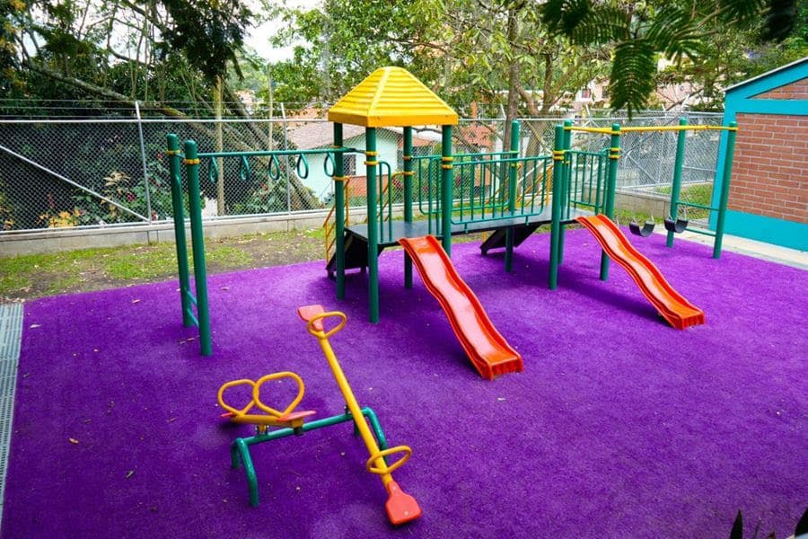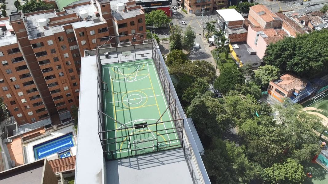 • Cancha múltiple con porterías nuevas, demarcación y grama sintética.