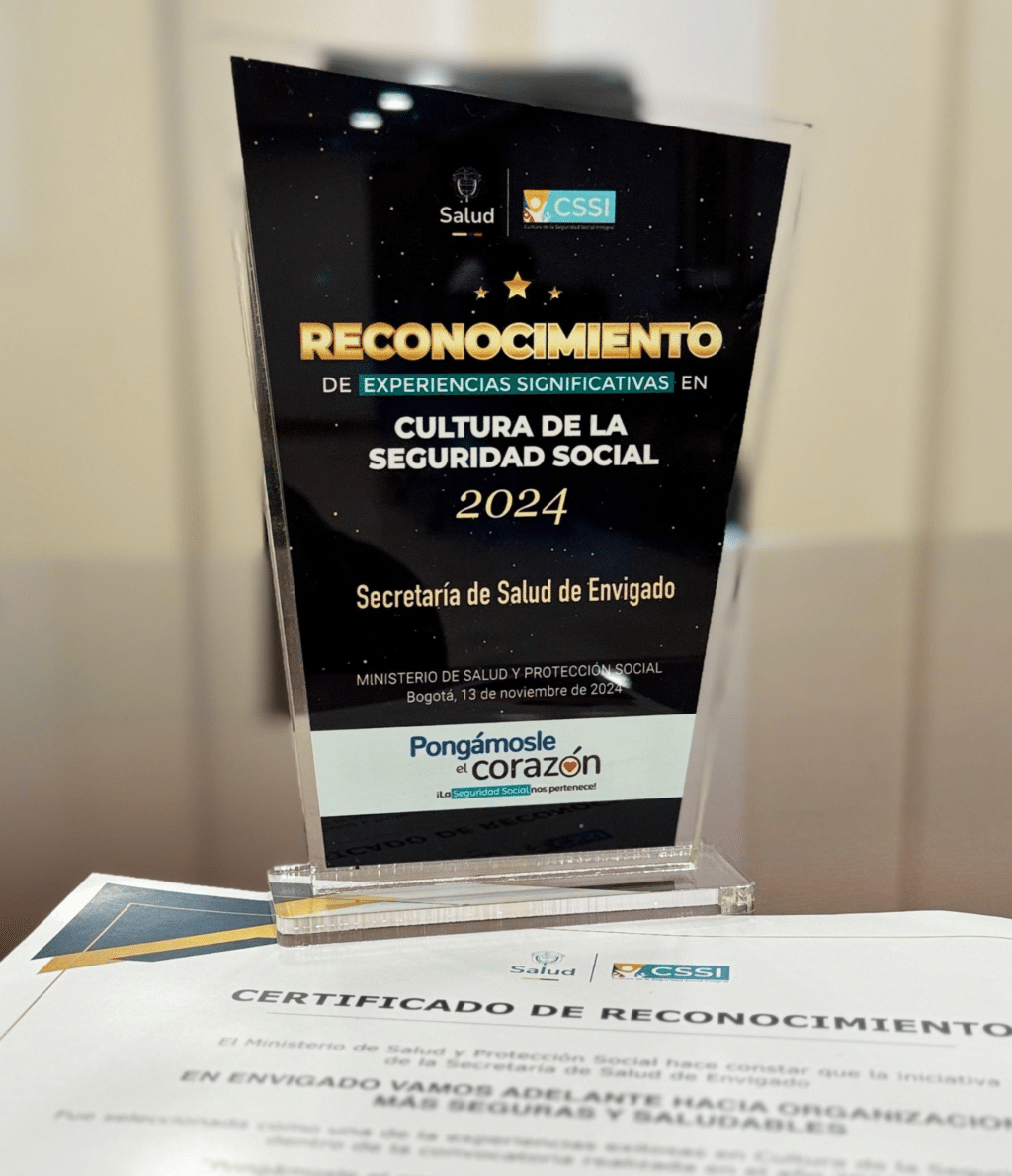 La Secretaría de Salud del municipio de Envigado, en el marco del evento de Reconocimiento de Experiencias Significativas en la Cultura de la Seguridad Social 2024, recibió un reconocimiento por parte del Ministerio de Salud y Protección Social gracias al proyecto: “En Envigado vamos adelante hacia organizaciones más seguras y saludables”, que forma parte del Plan de Intervenciones Colectivas de Salud Pública (PIC).