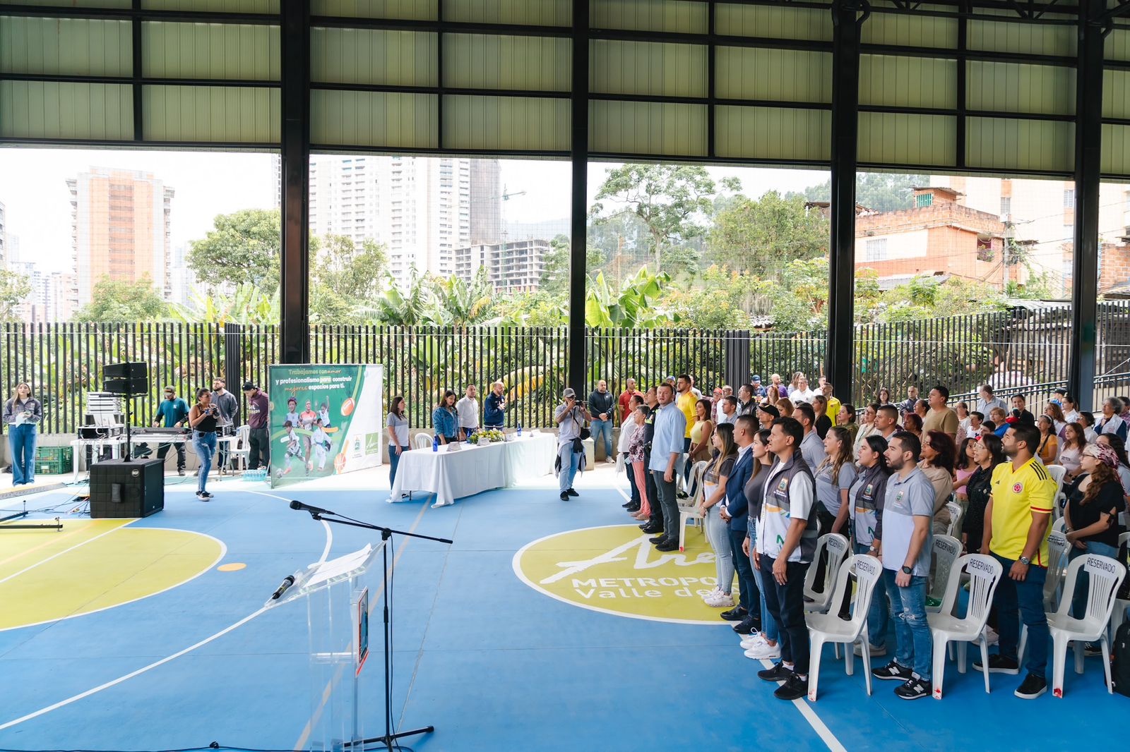 • La obra, construida conjuntamente entre el Área Metropolitana del Valle de Aburrá y la alcaldía de Sabaneta, beneficia a más de 6.000 habitantes Un espacio lleno de color, les da la bienvenida a las actividades deportivas y de sano esparcimiento que desde hoy disfrutan los habitantes de Cañaveralejo en el municipio de Sabaneta, con su nueva Placa Polideportiva.