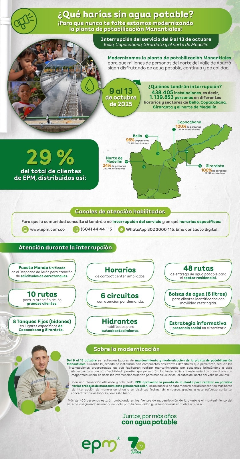 EPM agradece a la comunidad por su colaboración y paciencia con esta interrupción. Es importante destacar que estos trabajos no se pueden aplazar porque son indispensables para el avance de la modernización de la planta Manantiales.