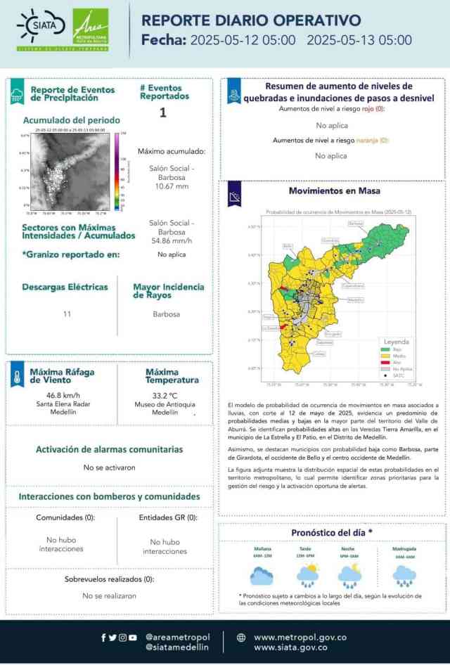 • El proyecto SIATA advierte que las lluvias continuarán y se intensificarán en los próximos días.