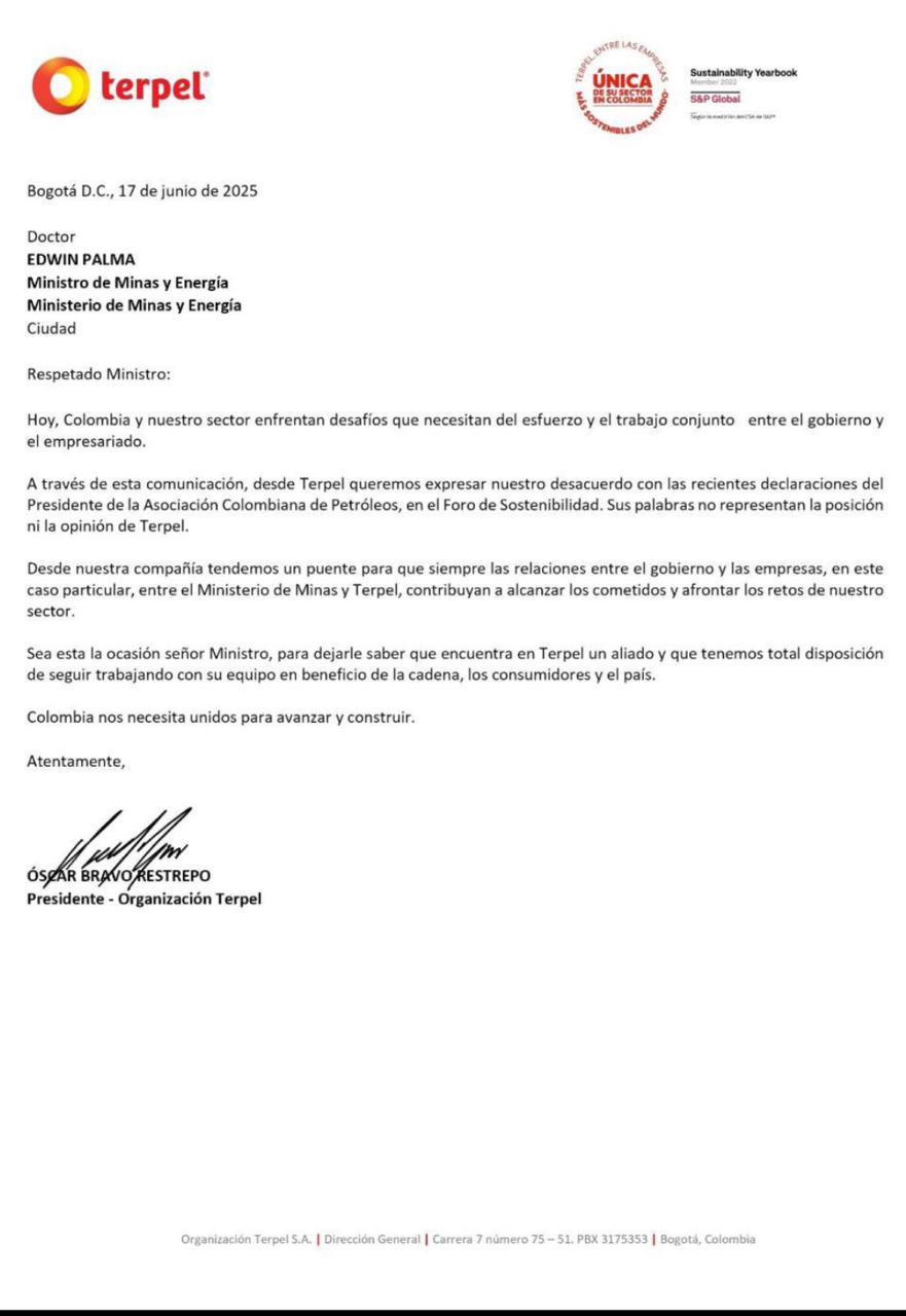 Esta posición se formalizó en una carta enviada el pasado 17 de junio al ministro de Minas y Energía, Edwin Palma, firmada por Óscar Bravo Restrepo, presidente de Terpel. (De PluralkidadZ). (Lea la carta de Terpel).