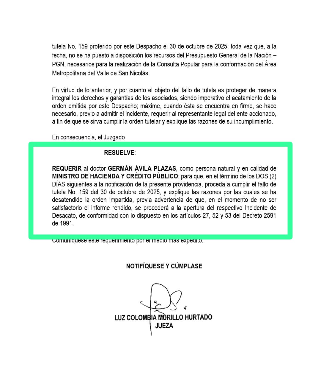 “Requerir al doctor Germán Ávila Plazas, como persona natural y en calidad de ministro de Hacienda y Crédito Público; para que, en el término de los dos días siguientes a la notificación de la presente providencia, proceda a cumplir el fallo de tutela No. 159 del 30 de octubre de 2025, y explique las razones por las cuales se ha desatendido la orden impartida, previa advertencia de que, en el momento de no ser satisfactorio el informe rendido,se procederá a la apertura del respectivo incidente de desacato”, se lee en la decisión judicial, proferida por el Juzgado Sexto de Familia de Oralidad.
